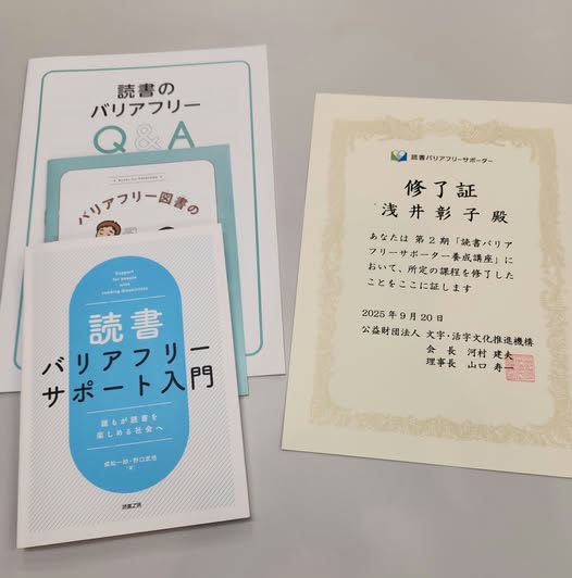 財団法人 文字・活字文化推進機構が開催した読書バリアフリー養成講座を受講し、2025年9月20日、最終講座を受講して、修了証をいただきました。